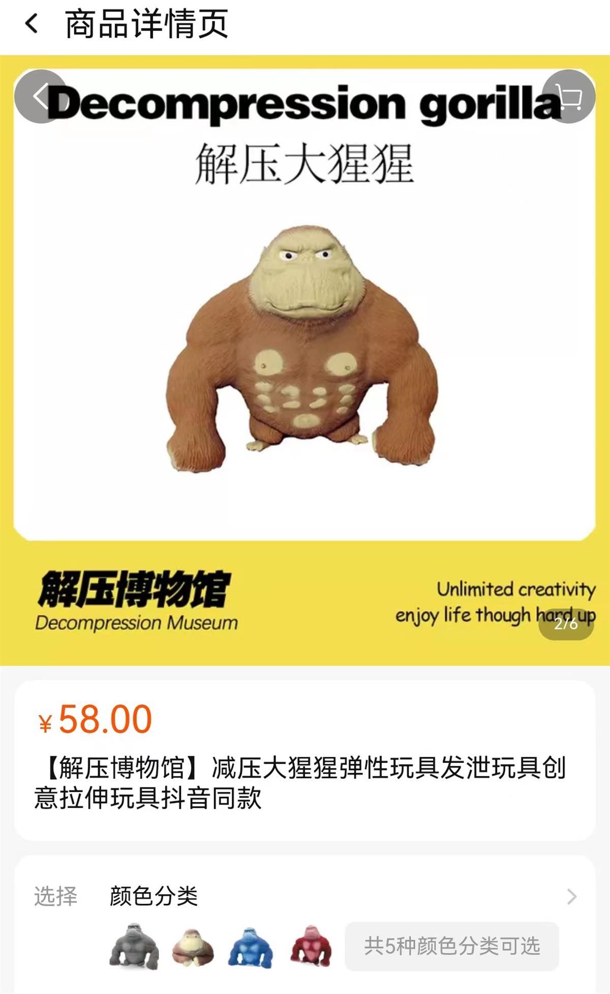 “相比普通的解压类小玩具,大猩猩客单价一只58元,已经算较高的价格了。但一上架每天都卖出百来个。”杜佳骏回忆。这也是品牌创立以来,店内人气最高的产品。