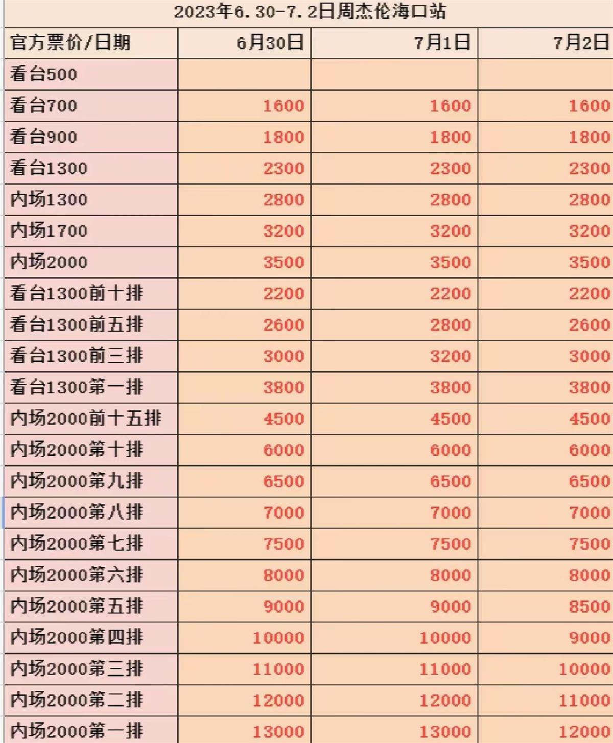 极目新闻记者在一位歌迷提供的周杰伦演唱会海口站票价表上看到,票面价700元、900元、1300元的看台票,分别被炒至1600元、1800元、2300元;票面价1300元、1700元、2000元的内场票,分别被炒至2800元、3200元、3500元。而这只是随机的后排座位价格,前排则“一排一价”。例如,票面价2000元的内场票,第一排价格13000元起,第二排12000元起,第三排11000元……以此类推。
