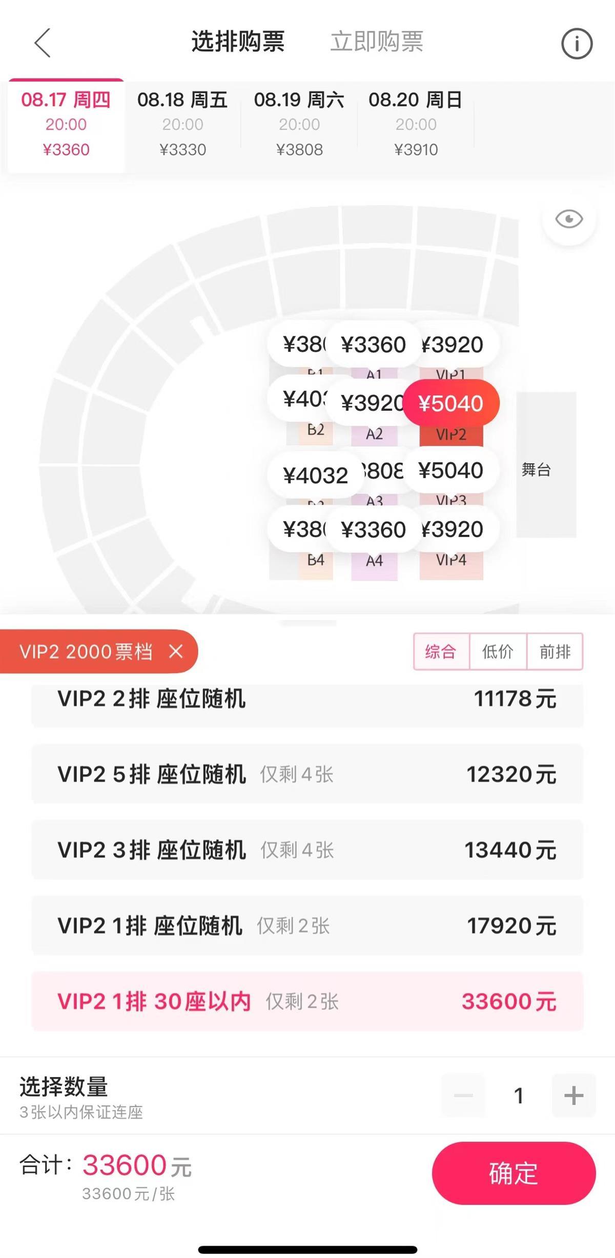 例如8月17日的周杰伦演唱会呼和浩特站,在票牛App上可直接选择场次和票档购票随机分配座位,也可选排购票,两种方式最高相差30000元左右:票面价2000元的VIP票,不选排的价格为3362元;如选排购票,最好的区域价格高达33600元。