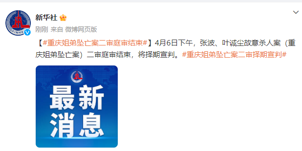 4月6日下午,张波、叶诚尘故意杀人案(重庆姐弟坠亡案)二审庭审结束,将择期宣判。