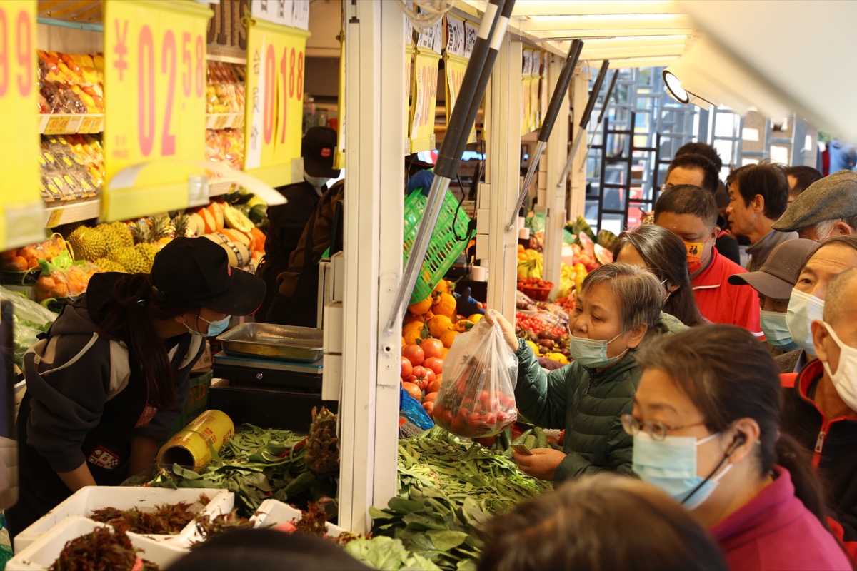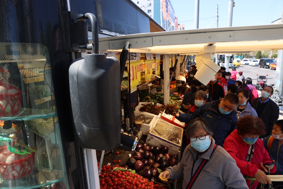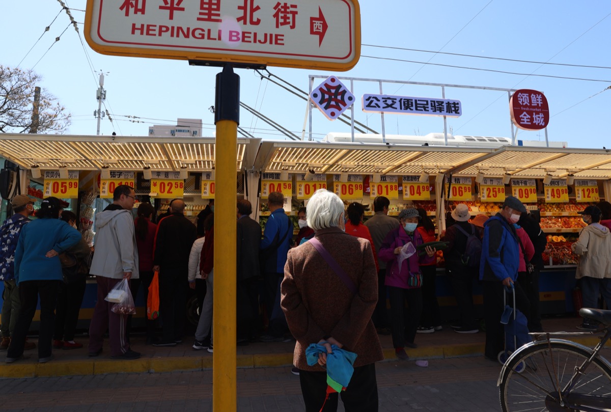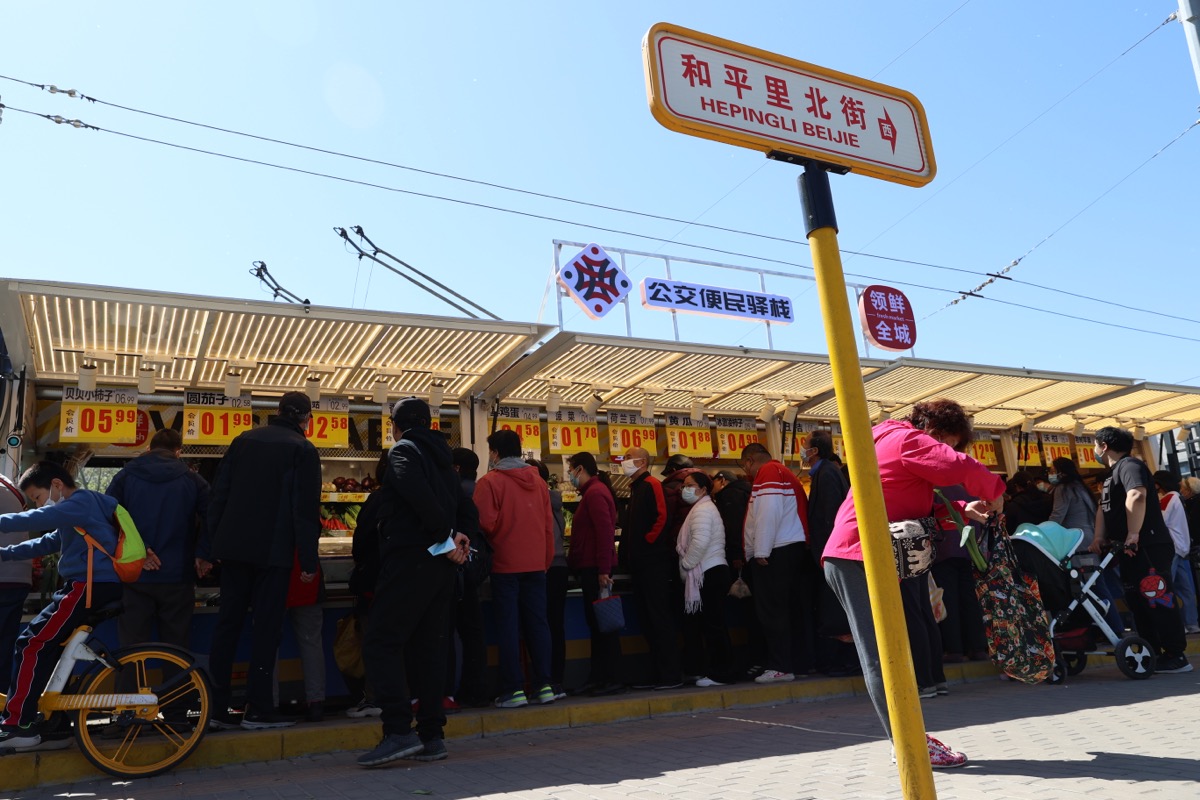 4月8日,正在北京市朝阳区柳芳“公交便民驿栈”前排队挑选果蔬的市民们。