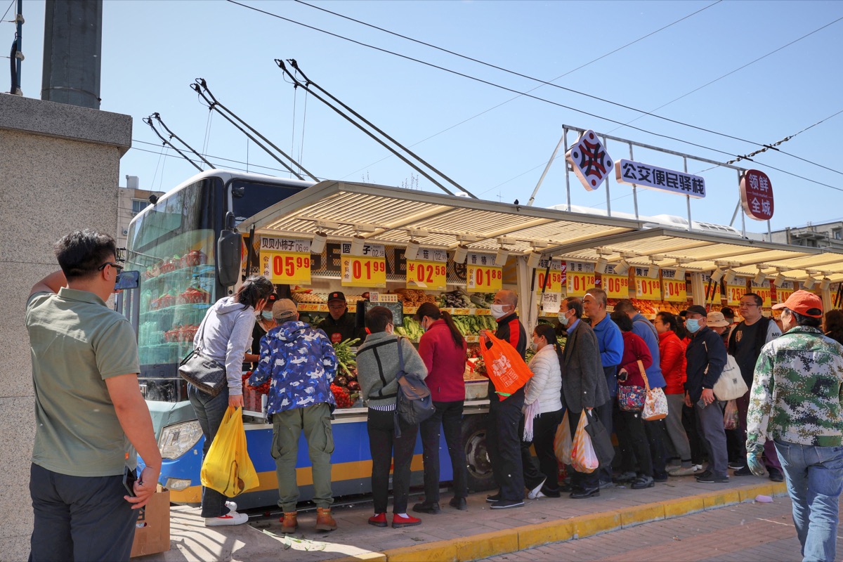 4月8日,在北京市朝阳区和平里北街路边,市民们在一个由废旧公交车改建的小型菜场前,排起长队。