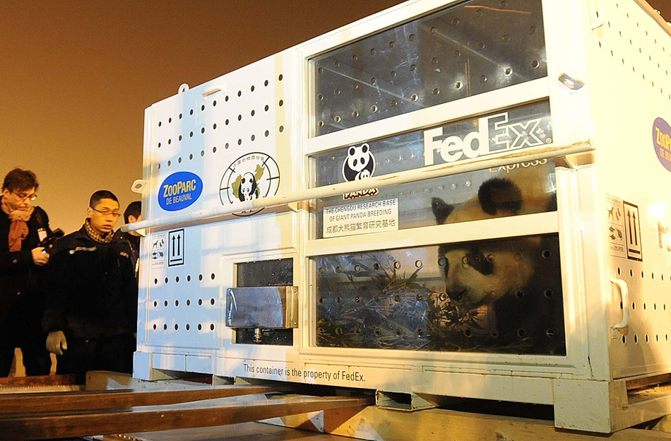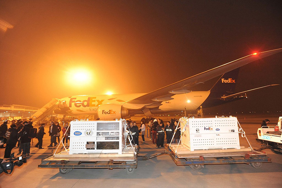 2012年01月15日,四川省成都市,赴法大熊猫“欢欢和圆仔”从双流国际机场登机飞往法国。视觉中国资料图