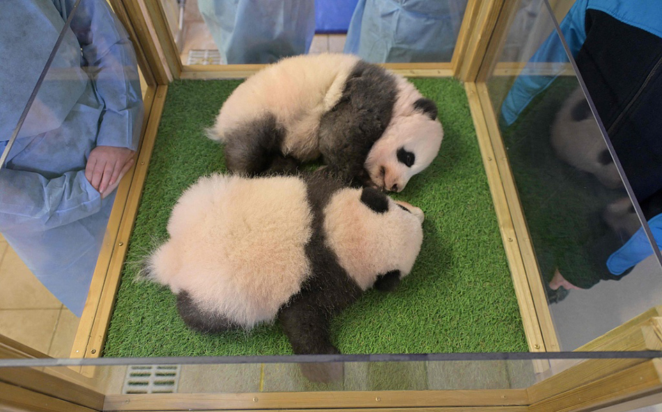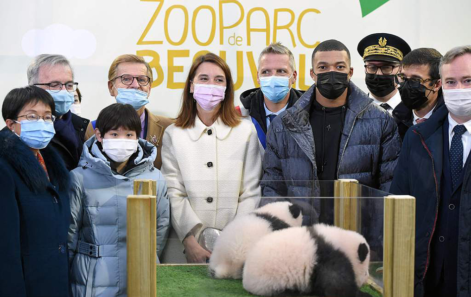 当地时间2021年11月18日,法国博瓦勒动物园为今年8月2日在此诞生的两只中国大熊猫幼崽举行了命名仪式。视觉中国资料图