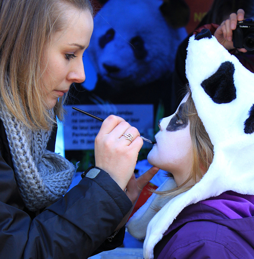 当地时间2012年1月15日,法国,当地群众打扮成熊猫的模样,等候大熊猫的到来。视觉中国资料图