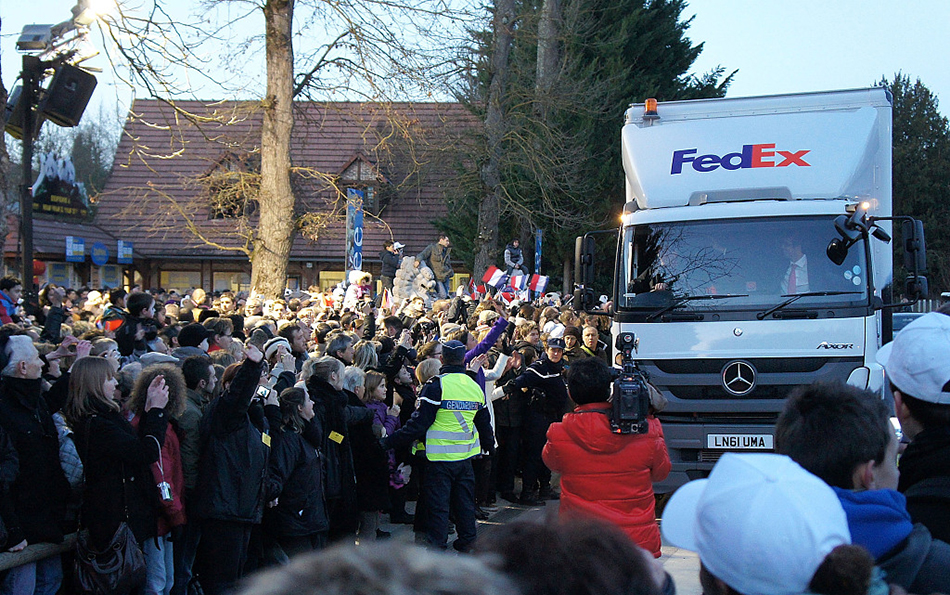 当地时间2012年1月15日,法国,赴法大熊猫“欢欢”和“圆仔”于当地时间19点左右到达圣艾尼昂市博瓦勒动物园,受到当地群众的热烈欢迎。视觉中国资料图