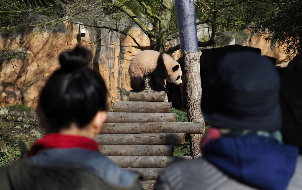 当地时间2018年1月13日,法国博瓦勒动物园,大熊猫幼崽“圆梦”迎来首次公众参观日。视觉中国资料图
