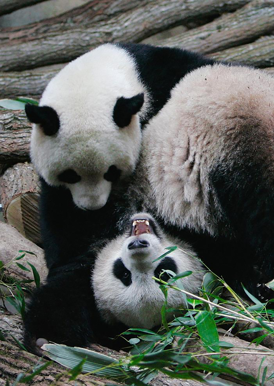 当地时间2021年3月20日,法国,大熊猫圆仔与欢欢在博瓦勒动物园内。视觉中国资料图