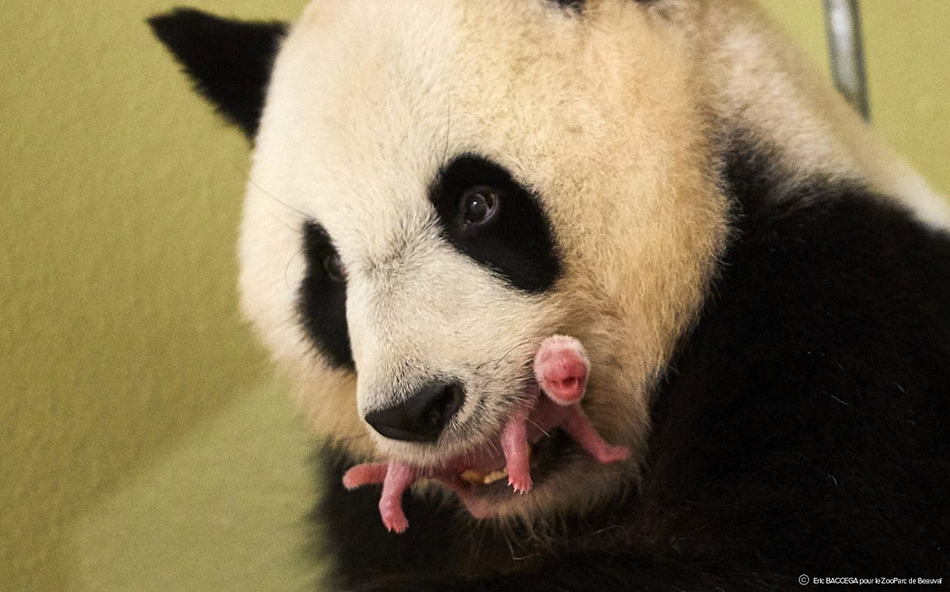 当地时间2017年8月6日,法国博瓦勒动物园,旅法大熊猫“欢欢”和它于4日产下的幼子“圆梦”。视觉中国资料图