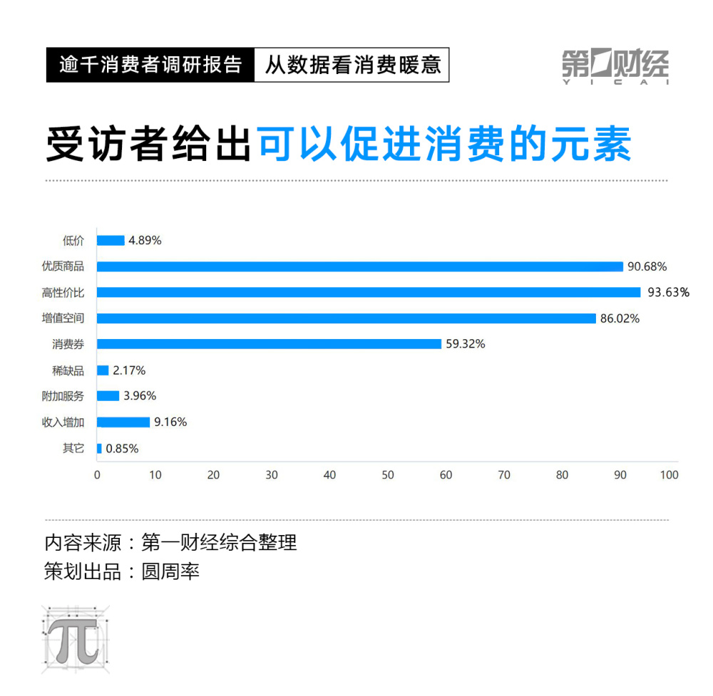 在“什么元素是可以促进您消费的?”这一问题下,高性价比占93.63%,优质商品占90.68%,增值空间占86.02%,而低价因素占比仅为4.89%。由此可见,就商品而言,相比价格低廉,当下消费者更注重的是品质。