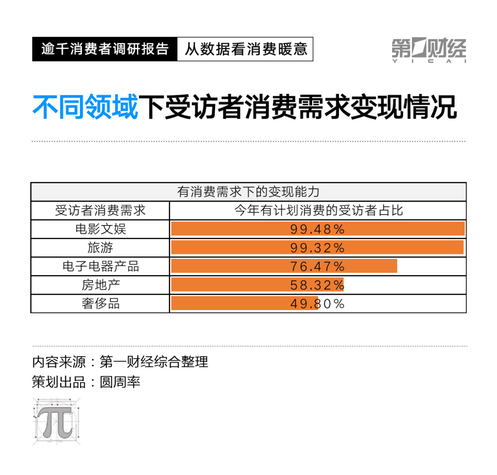 除了餐饮、服饰、健康三种基本消费需求,我们还选取了电影、旅游、房地产、电子电器和奢侈品五个比较有代表性的消费品类,对受访者提出了“今年是否有购买计划”的问题,得到了在这些消费领域中,消费需求的变现程度。
