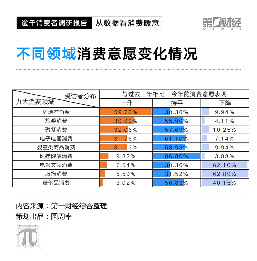 整体消费意愿提升明显的还有餐饮、电子电器消费品和婴童类商品。意愿上升占比均超过了30%。