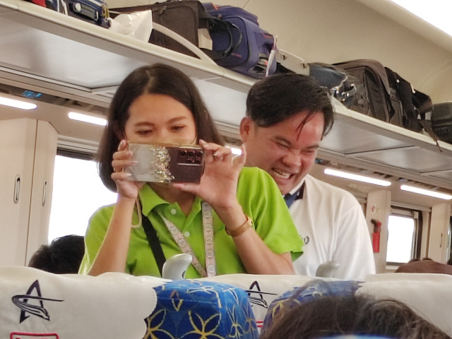 车内的广播和文字说明同时使用老挝语、汉语、英语三种语言,不会让中国旅客感觉到任何的不便。不过,和国内乘客上车后的“淡定”相比,大多数老挝旅客上车后很快就进入了“打卡”拍照和自拍模式,希望记录下这里的每一个细节。