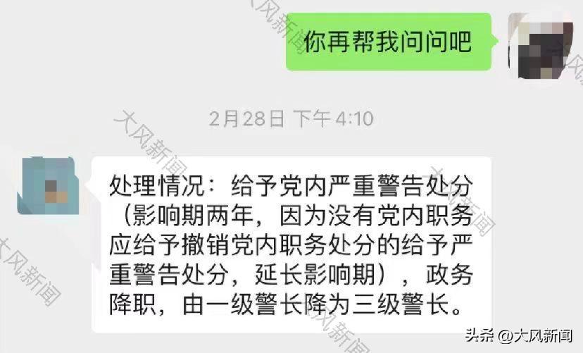 当事女子提供的其与沂水县纪委工作人员微信沟通的处理情况显示,给予涉事指导员党内严重警告处分。同时还有政务降职,由一级警长降为三级警长。