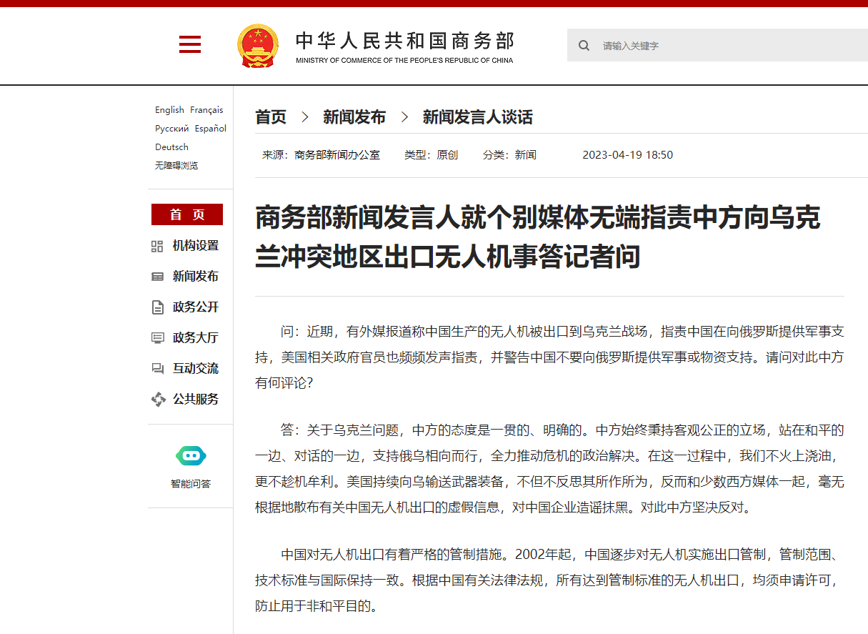 问:近期,有外媒报道称中国生产的无人机被出口到乌克兰战场,指责中国在向俄罗斯提供军事支持,美国相关政府官员也频频发声指责,并警告中国不要向俄罗斯提供军事或物资支持。请问对此中方有何评论?