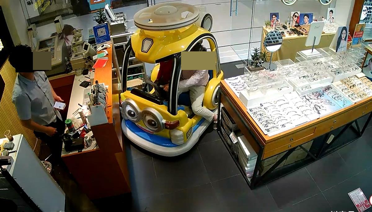 监控视频显示,4月20日傍晚6时许,在一家商场的走道内,一位女士正驾驶一辆儿童玩具车,载着一个小男孩在玩耍。突然,玩具车方向失控,慢悠悠地冲进了一家眼镜店,撞到摆在门口的展示柜后,停在了柜台前。展示柜被撞移位,摆在上面的两个亚克力摆台翻到了地面上,坐在柜台内的老板随后起身查看情况。