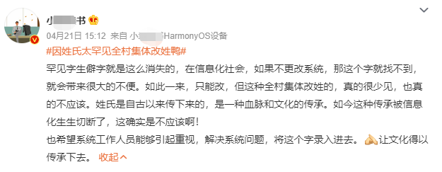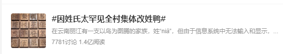 近日,一个村因这一生僻字登上了热搜。在云南丽江,一支以鸟为图腾的家族,姓(nià),但由于信息系统中无法输入和显示,带来种种不便,只能改姓“鸭”。村民称如果不改姓,银行卡都用不了。