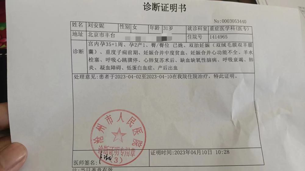 据沧州市人民医院的诊断证明显示,刘安妮宫内孕35+1周,双胎妊娠,已分娩,重度子痫前期,妊娠合并中度贫血、妊娠合并心功能不全、羊水栓塞、呼吸心跳骤停、心肺复苏术后,缺血缺氧性脑病,呼吸衰竭、肺炎、凝血障碍、低蛋白血症、产后出血。