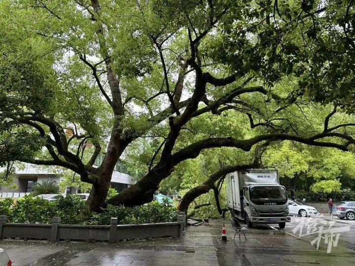 上午10点,橙柿互动记者赶到现场,事发地点位于杭州市青少年活动中心南门口,一棵古香樟树的一段粗大树枝断落,压住了一辆浙F车牌的厢式货车顶部,没有人员受伤,执法人员已经在现场处理。