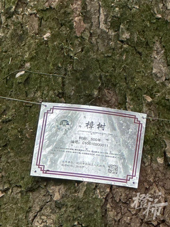 树干上还有一块古树名木铭牌,上面显示这是一棵树龄500年的樟树。