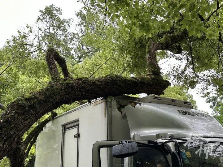 货车司机吴师傅说,这是一辆冷藏车,从萧山拉了一车蔬菜,准备去少年宫食堂。今天早上5点多,行驶到这里时,车厢右前方与香樟树发生了刮擦,树枝掉落下来,车也开不了了。