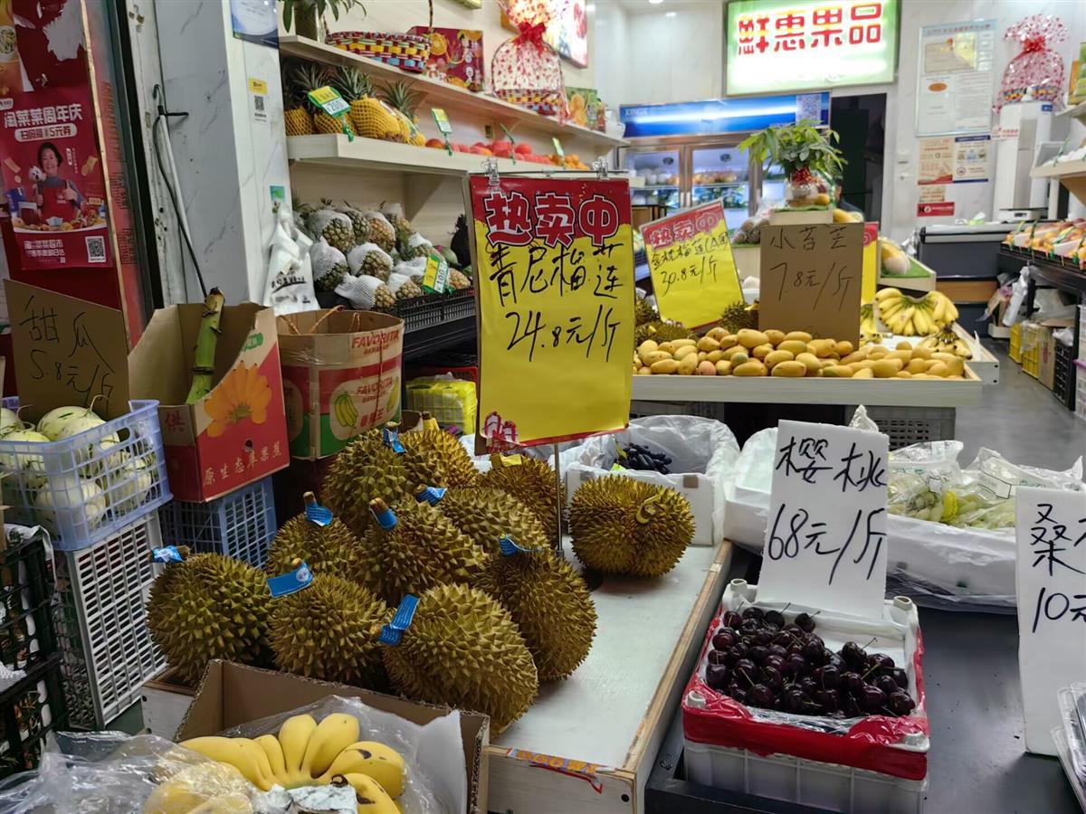 在这家超市里,在售的泰国金枕榴莲每斤29.9元。导购员介绍,同样品种、同样货源的榴莲在4月初时的价格是38.9元一斤,3月中旬时则卖到42.9元一斤:“一个月便宜了十几块钱,降价幅度还是蛮大的。”