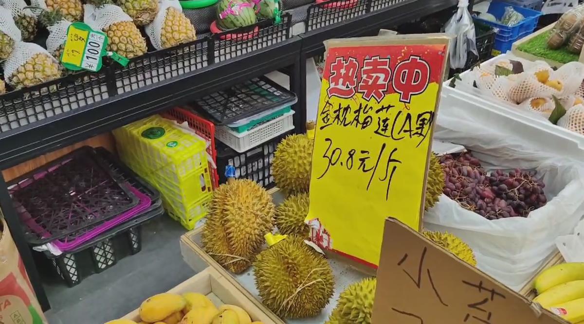 一家水果大卖场里,在售的金枕榴莲每斤30.8元,店主称是同品种里的“顶级货”;更便宜的是甲仑榴莲,每斤只要24.8元,有市民买了一颗小榴莲,称过以后的价格刚刚过100元。