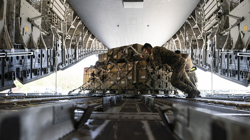 当地时间2022年4月29日,美国多佛,在多佛空军基地,一托盘的155毫米炮弹引信被装载到一架C-17运输机上,最终运往乌克兰。人民视觉 资料图