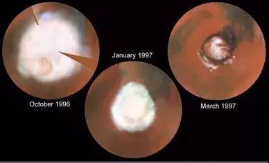 ▲望远镜观测到的火星北极极冠变化图 图片来源:美国亚利桑那大学