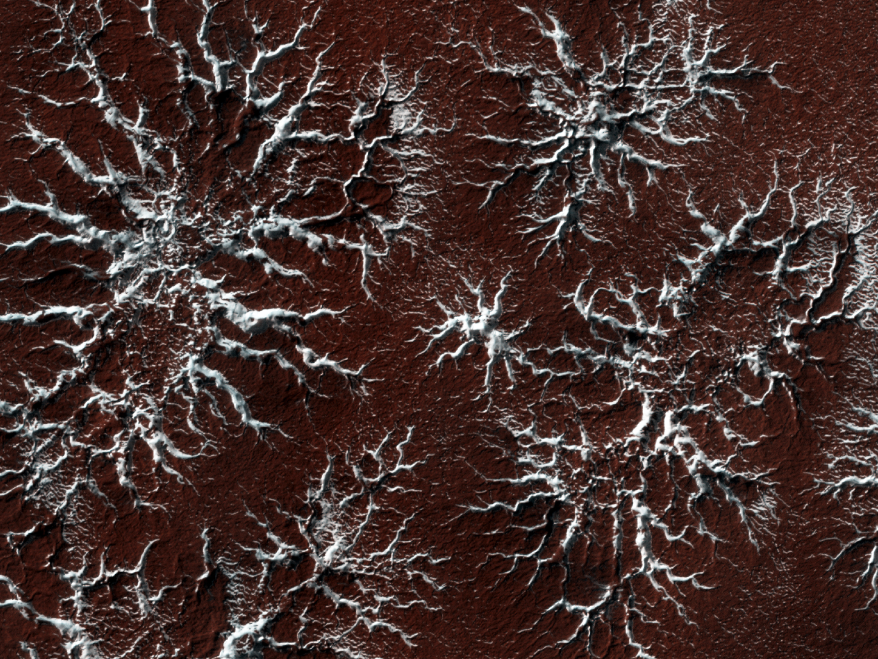 ▲在火星上,到了春夏,干冰会从固态变成气态,并导致表面受到侵蚀,只留下刻在表面的类似蜘蛛一样的通道。来源:NASA/JPL/亚利桑那大学