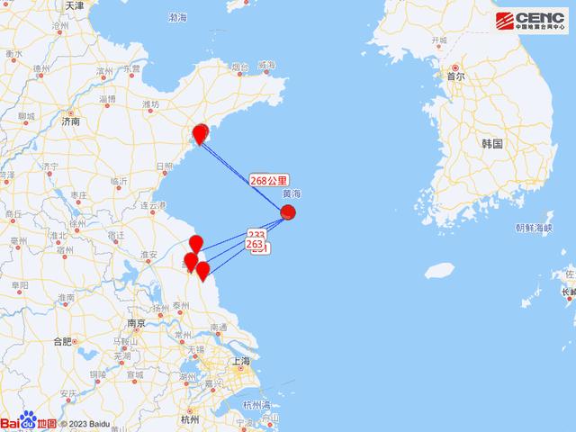 震中距江苏射阳县233公里、距江苏盐城大丰区251公里、距江苏盐城亭湖区263公里、距山东青岛崂山区266公里、距山东青岛市南区268公里,距江苏盐城市268公里,距上海市385公里。