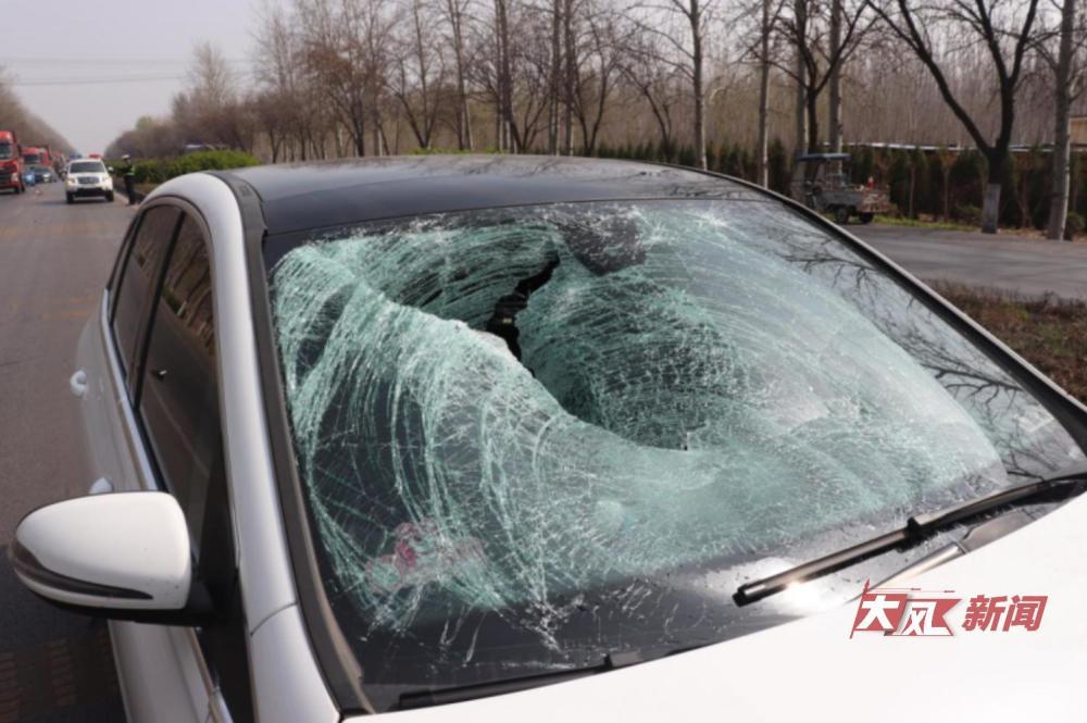 白色奔驰车前挡风玻璃和车前保险杠破裂