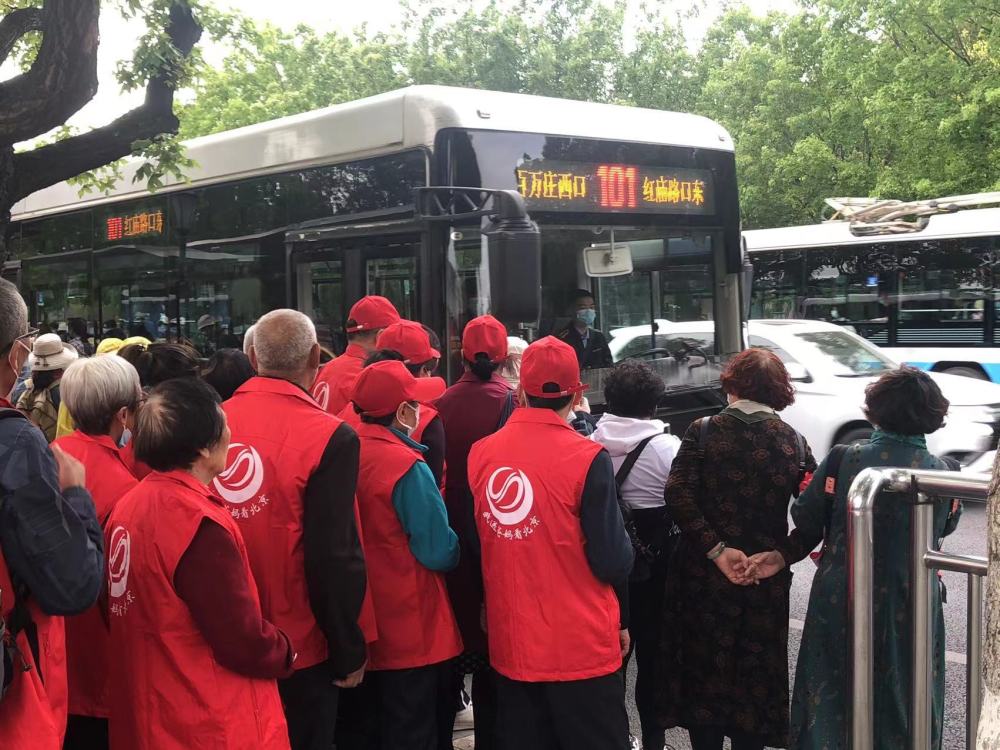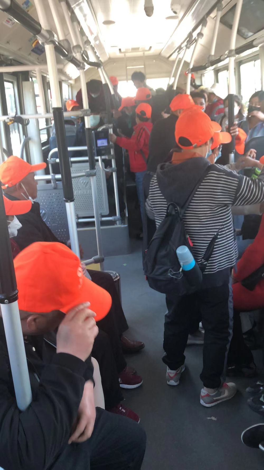 好不容易等到游客都上了车,隔着车窗一看,红帽子、红马甲,车里已经是红彤彤的一大片,几乎占满了车厢。临近晚高峰,站台上不光有游客,很多市民陆续来乘公交车回家。看着眼前这通乱,一些人无奈只好再等下一辆车。