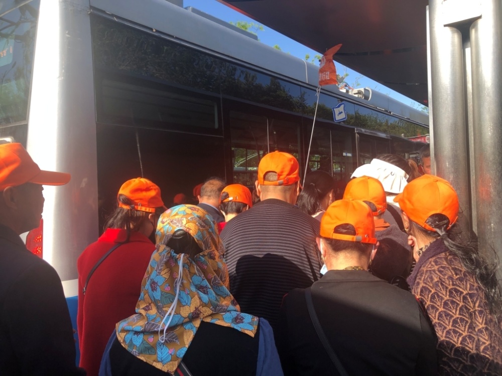 111路公交车一进站,北海北门公交站立刻热闹了起来。站台上都是戴着小红帽的旅游团游客,为了顺利引导他们上车,公交车司机、随团的导游、站台志愿者都开启了“高声大嗓”模式。游客们一拥而上,车辆的前门、后门都堵了个严实,司机在车上喊:“前门上车,到前面来!刷卡!”志愿者喊:“别挤别挤,都能上去,您这么大岁数了别挤,肯定有您的座儿!”导游在车门前一边数着人数,一边抻着脖子冲司机喊:“先让他们上去,他们不会刷卡,我来补票!”