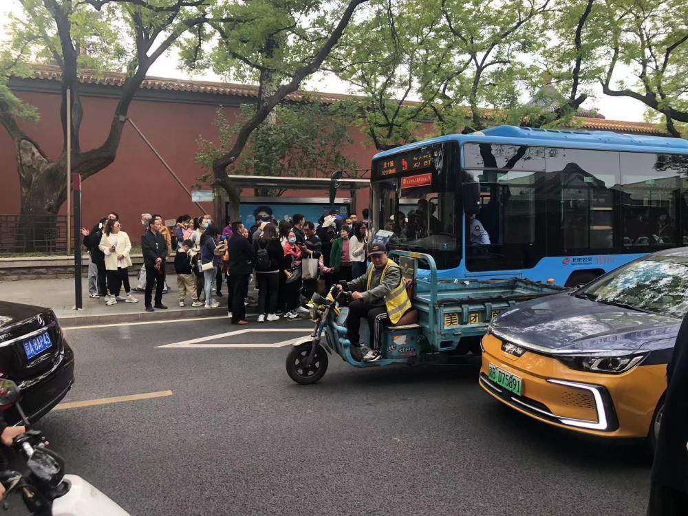 以景山西街为例,道路两侧有北海公园和景山公园,同时又靠近故宫,这里的公交站在这条街上是个明显的堵点。无论是站台还是公交车,能容纳的人数早已超负荷。小小的公交站台上,等公交车的游客数以百计,便道甚至机动车道上都站满了人。4月26日下午,记者走访过程中,就看到这样的景象:5路公交车一进站,乘客、旅游团都想一股脑地往上挤,可这么多人谈何容易,旅游团的人只上去了半数,导游和公交车司机现场商量,是先走一部分人还是已经上了车的再下来。一来二去,公交车在站内等候的时间被拖延,北向南方向的机动车道就这么堵死了。