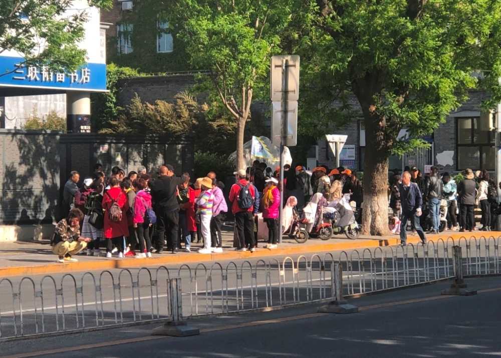 这也导致了每天下午美术馆东街都像庙会一样热闹。4月26日下午,三联韬奋书店门前、马路对面都站满了游客,各旅游团的小旗子一面挨着一面,临近晚高峰,还不断有新的旅游团从四面八方汇聚过来。人群中,不少老人喘着粗气焦急地询问导游什么时候来车。77岁的游客张老伯一脸疲惫,他形容这一天的游览堪比“拉练”,跟着旅游团走了很多地方,前门、北海公园、故宫等,老人的手机上显示,这一天他走了将近4万步。