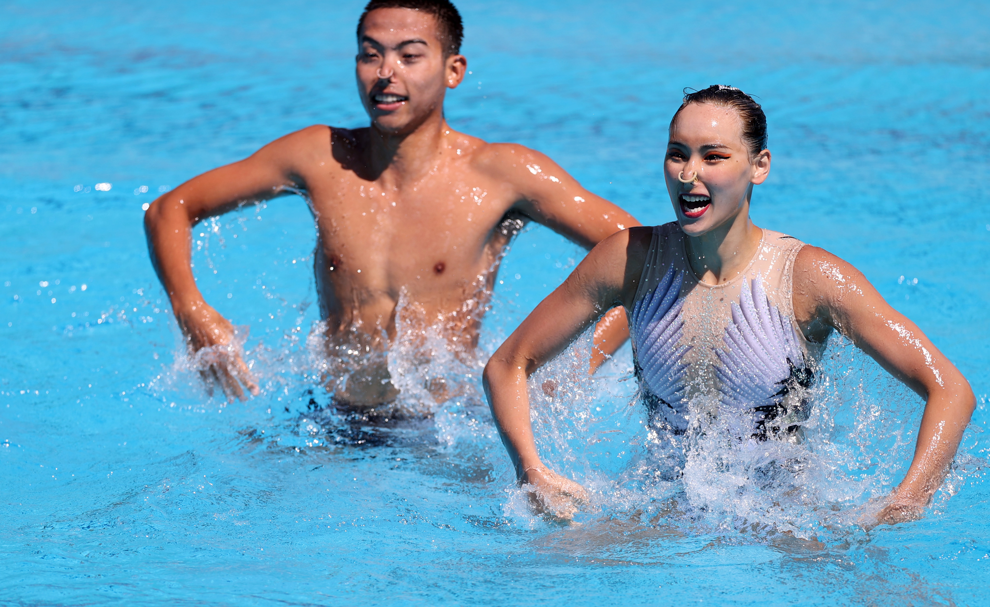 2022年6月25日,石浩玙(左)/张依瑶在2022年世界游泳锦标赛花样游泳混双自由自选决赛中。新华社记者李颖摄