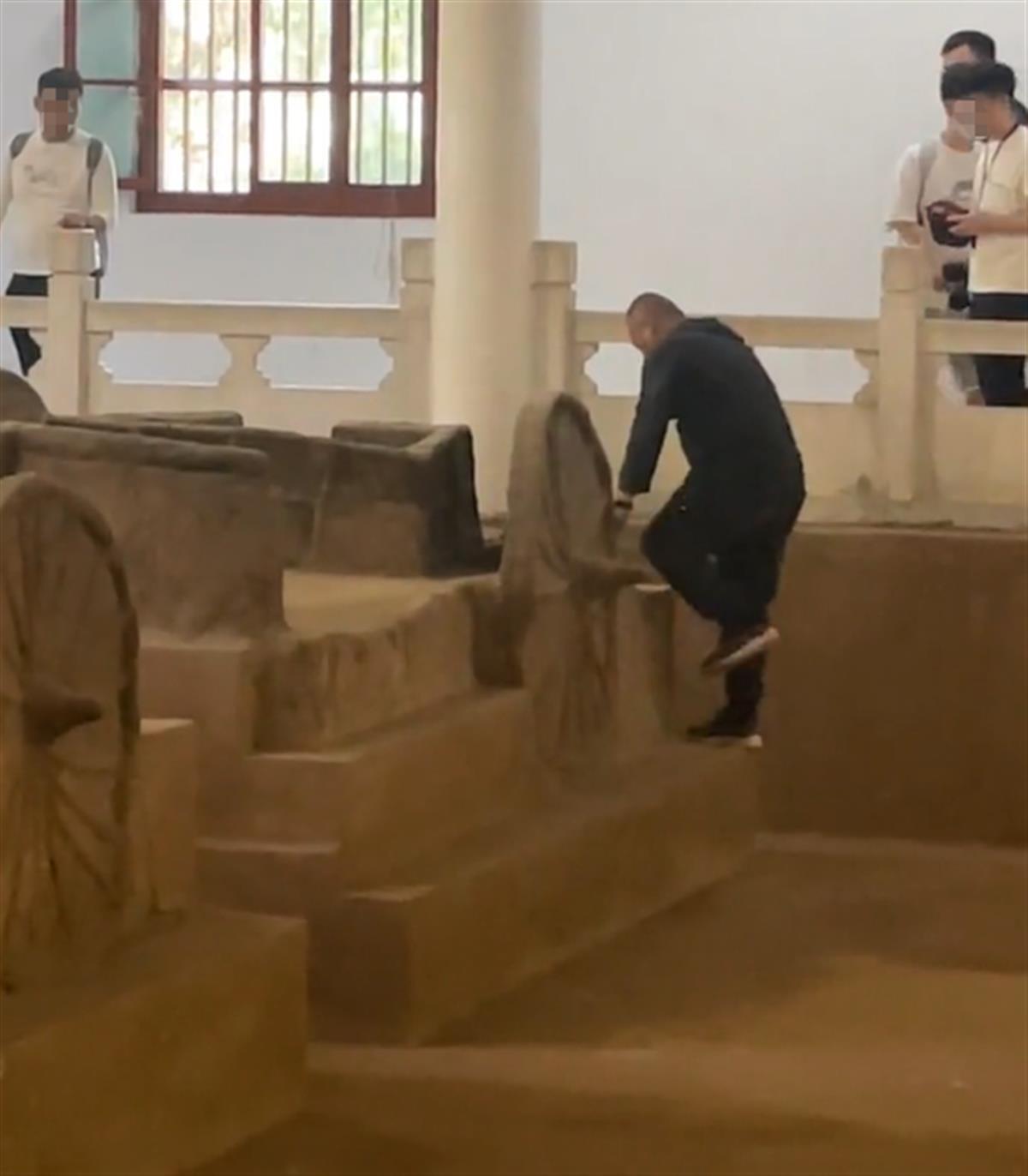 视频显示,在博物馆展坑前,男子翻越护栏进入展坑捡东西,随后男子试图再次翻出展坑,翻越过程中男子不慎摔了跤,跌坐在展坑内。