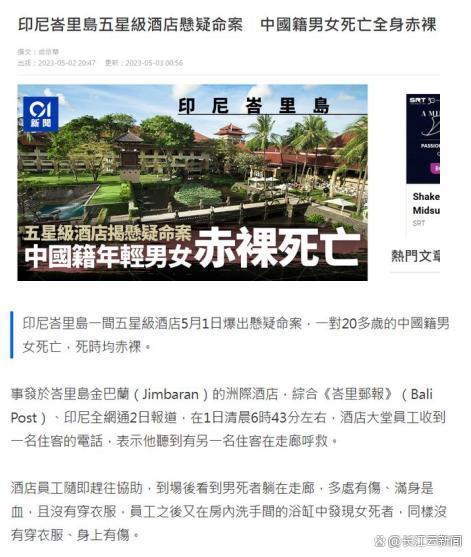 据多家当地媒体报道,5月1日,位于印尼巴厘岛的洲际酒店发生了一起惊悚的命案,两名中国游客不幸身亡。