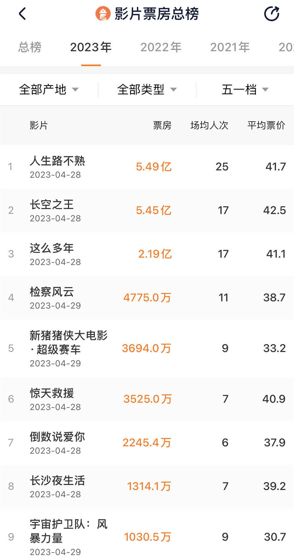 据悉,今年五一档总观影人次超3700万,总排片场次达230万场,仅低于2021年水平。电影市场回暖也直接反映在电影票价上,平均票价升至40.4元,成为历史“第二贵”的五一档,次于2019年五一档的43.5元。