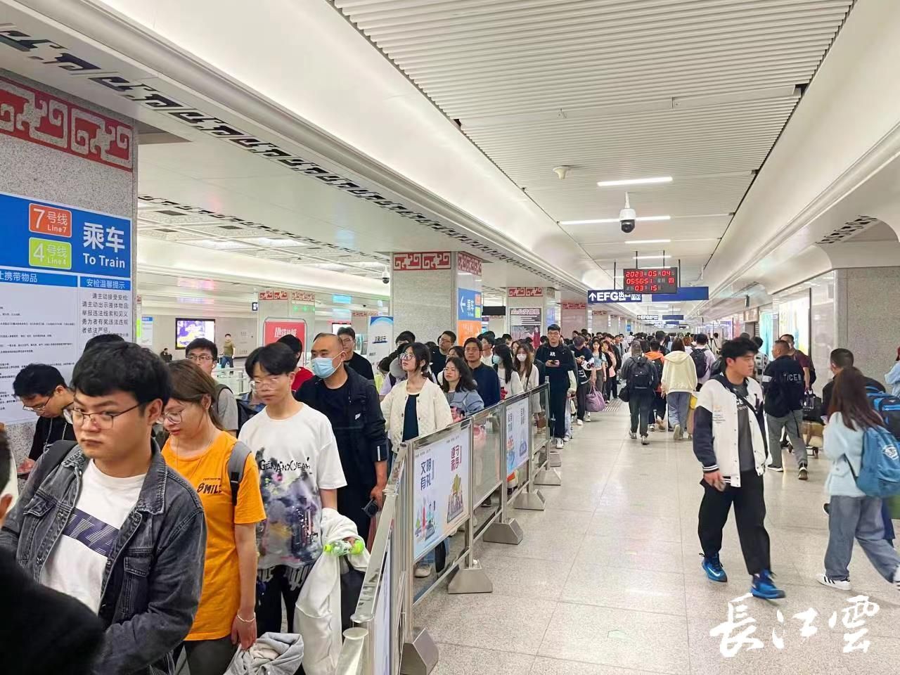 5月3日为假期最后一天,地铁返程客流明显。下午开始为“四站一场”客流集中到达时段,相关地铁站做足准备,启动相关客流组织方案:4号线武汉火车站,开启2台备用安检机并增设无包通道、小包快检通道,保障市民乘客快速进站,同时分流部分乘客从5号线武汉站东广场站进站;2号线汉口火车站,增加进站闸机数量、利用铁马将进出站乘客分开,避免客流交叉;4、7号线武昌火车站引导乘客分开进站,避免客流积压。与重点交通枢纽站无缝衔接的2、4号线,段场内增设多列备用列车,根据客流可及时上线投入运营。3日晚11时结束运营至11时35分,4号线增开2趟武汉火车站开往柏林方向列车,专程运送回汉乘客返程。