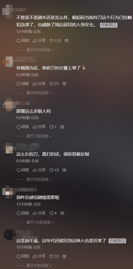 有上传视频的网友称,“过程太突然了,没来得及,听说直播约架,那哥们直接提刀来了。”有网友称,被砍男子是青岛即墨区的网红“xx老九”周某某,“此前他也曾因为感情问题被人殴打过”。不少网友质疑“是不是有剧本”,许多网友被黑衣男子持有的长刀吓到,表示必须要“严惩砍人者”。记者私信“xx老九”短视频账号,对方称不方便回应,未对是否是被砍男子本人作出正面回应。