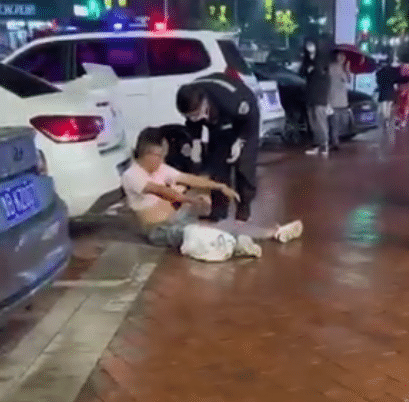 另一段视频显示,白衣男子脱掉外套身着短袖瘫坐在地上,警方正在帮忙处理伤口,随后被警方带走。此外还有数段不同角度的视频在网络流传。