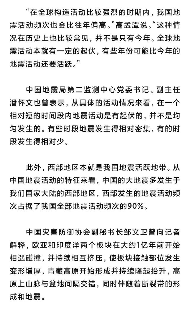 “因青藏高原隆起作用,我国陆地地震活动的主体在西部,特别是高原周边地区地形变化差异大,应力积累释放周期短(地震频繁),一次性能量释放多(震级大)。而且,青藏高原东缘是中国西部相对人口密集区,是我国最主要的地震带(南北地震带),灾害重。”