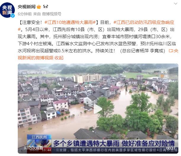 @央视新闻 微博消息,目前,江西已启动防汛四级应急响应。5月4日以来,江西先后有10县(市、区)出现特大暴雨,29县(市、区)出现大暴雨。其中,抚州部分城镇出现内涝;宜春丰城市丽村镇河堤溃口30余米,下游4个村庄被淹。江西省水文监测中心已发布洪水蓝色预警,预计抚州临川区临水河段将出现超警戒0.5米左右的洪水。