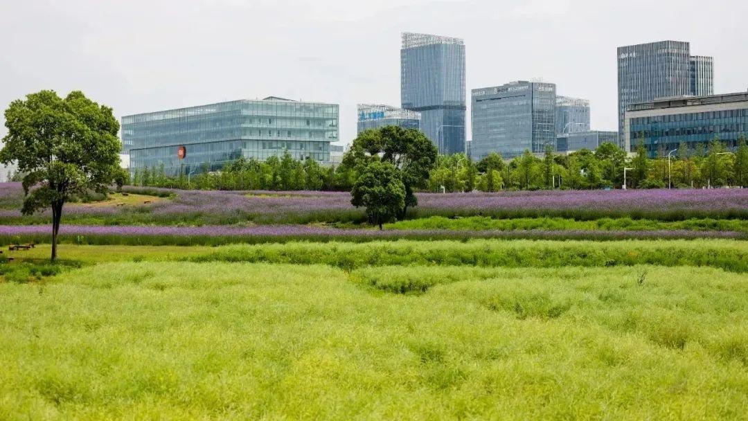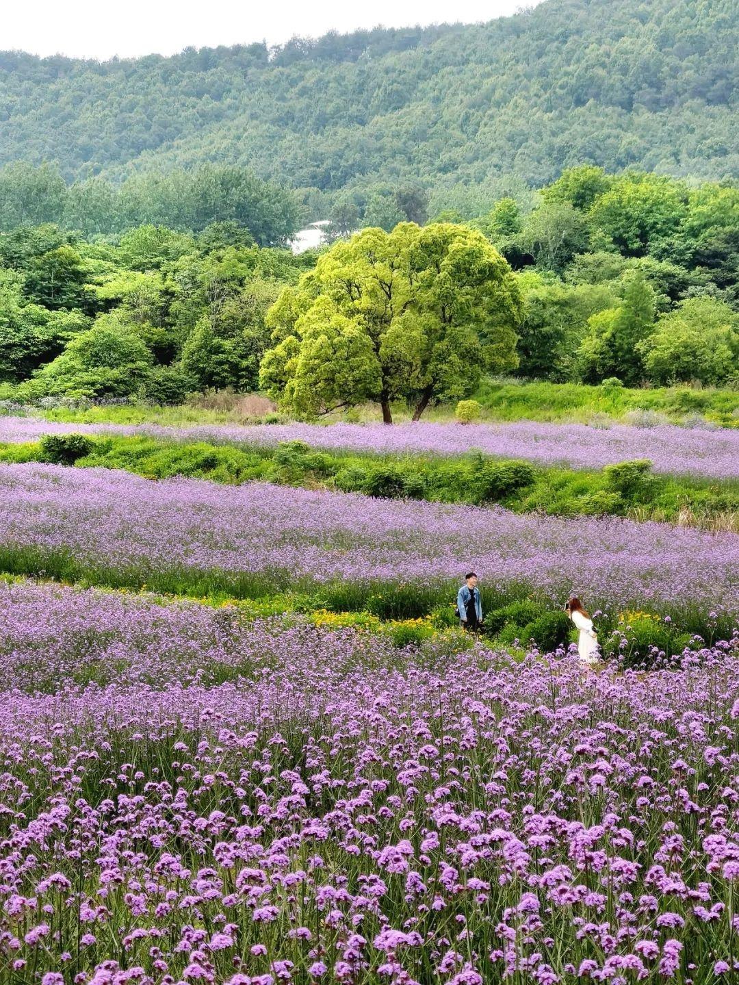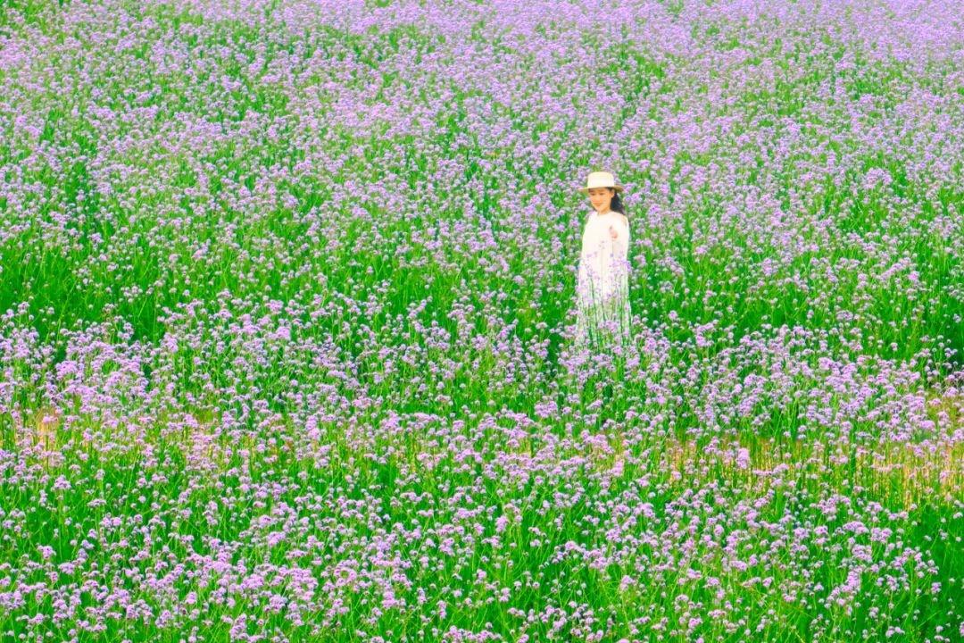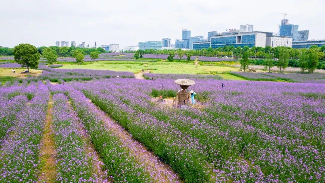 大片齐腰高的柳叶马鞭草花团锦簇,迎风摇曳,形成浪漫、舒朗的氛围。今年盛花期约较去年提前了10天,与即将丰收的油菜同框,相映成趣。