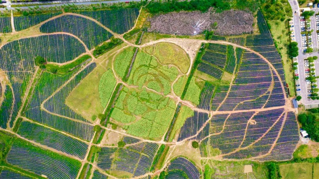 建设方介绍,这一花海以多年生的柳叶马鞭草为植被基底,中间采取油菜花、向日葵、水稻等农耕作物轮作。从上空俯瞰,宛若花朵绽放。