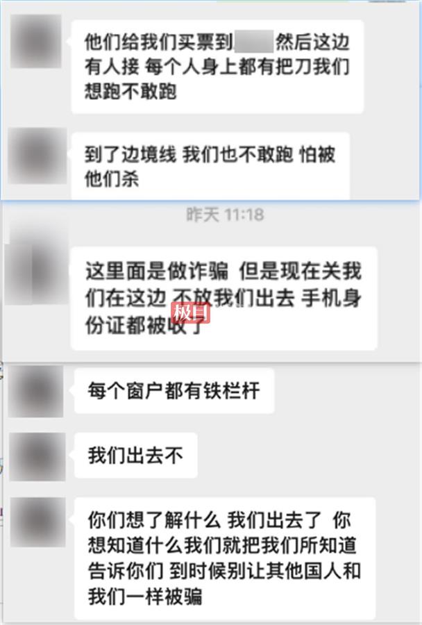 “他们给我说,过来打工吧,这边工资高,一个月能挣两三万元,而且他们还答应给我们买车票,另外路上的吃住费用也都是他们包,我们就傻乎乎地来了,见面后发现情况不对,可是想跑的时候已经晚了。”李某娇告诉极目新闻记者,见面后,对方就拿走了她的身份证,随后把她同其他几人带到了缅甸,“有人来接我们,他们每个人身上都有把刀,我们想跑不敢跑。”