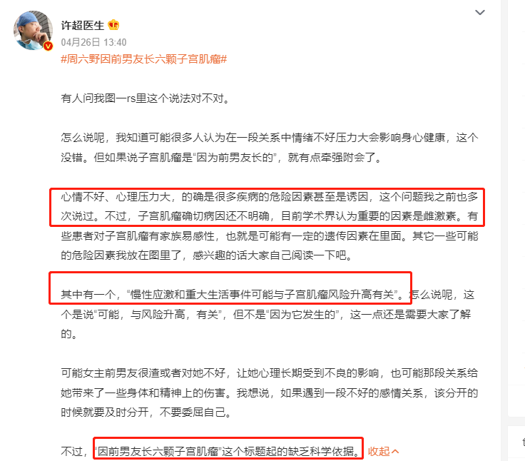 微博大V“许超医生”称最近也收到不少私信问子宫肌瘤和情绪的关系。他认为,“因前男友长六颗子宫肌瘤”这个标题,缺乏科学依据。