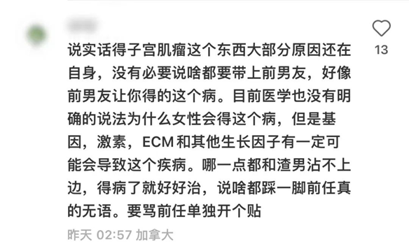 所以,“忍一时乳腺增生,退一步子宫肌瘤”这话不假。周六野说的要及时离开一段不健康的关系,不要内耗委屈自己,这是非常正确的。但如果说子宫肌瘤是“因为前男友长的”,这个在医学角度解释是不够准确的。